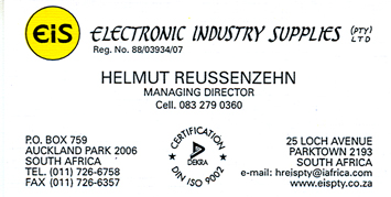 EIS has been in existence since 12 July, 1988 and in that time has moved from strength to strength. The main trust of our Business is the supplying of imported electronic and electrical components and related materials. EIS has established a reputation of such reliability and high quality that Siemens has given us the go-ahead to ship to stock, without prior inspection. We also have earned their trust and respect with our constantly excellent service. A further indication of the EIS exceptional standards is the fact that we are the proud recipients of the ISO 9002 certificate. The components that we supply are brought in from Germany, England, Belgium, Switzerland, USA, Japan and Hong Kong. We attend, at least once a year, an exhibition in Germany called Electronica and Productronica which alternate each year and which enable us to keep up to date with continually changing technology. "We rate customer satisfaction as our most prominent and important objective."